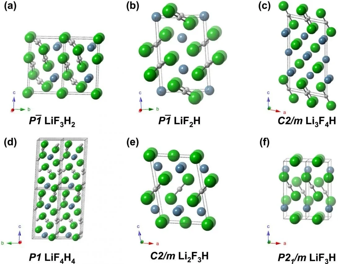 Exploratory calculations on the Li3F4H composition predict a structure that contains bent and asymmetric bifluoride anions, as well as infinite HF chains with nearly equal bond lengths, whose enthalpy lies 21.7 meV/atom above the convex hull. The fact that Li3F4H is predicted to be thermodynamically and dynamically stable at ambient pressure, suggests that other Li-F-H compounds with unique HnFn+1-type compositions could also be synthesized and stabilized at ambient conditions (Fig. 1).