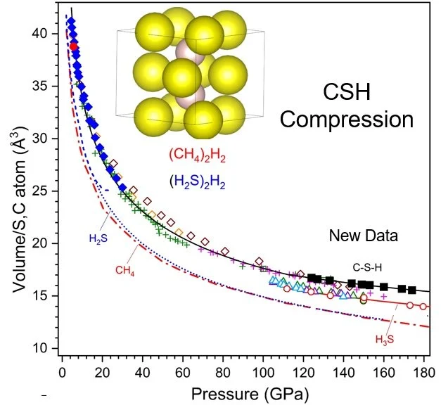 The formation and stability of the C–S–H compound may be understood in terms of the close similarity in effective volumes of the H2S and CH4 components (Fig. 1) Denser carbon-bearing S–H phases are predicted to form at higher pressures, and the current results provide a critical starting point for understanding the very high superconducting transition temperatures found in the C–S–H system at megabar pressures.