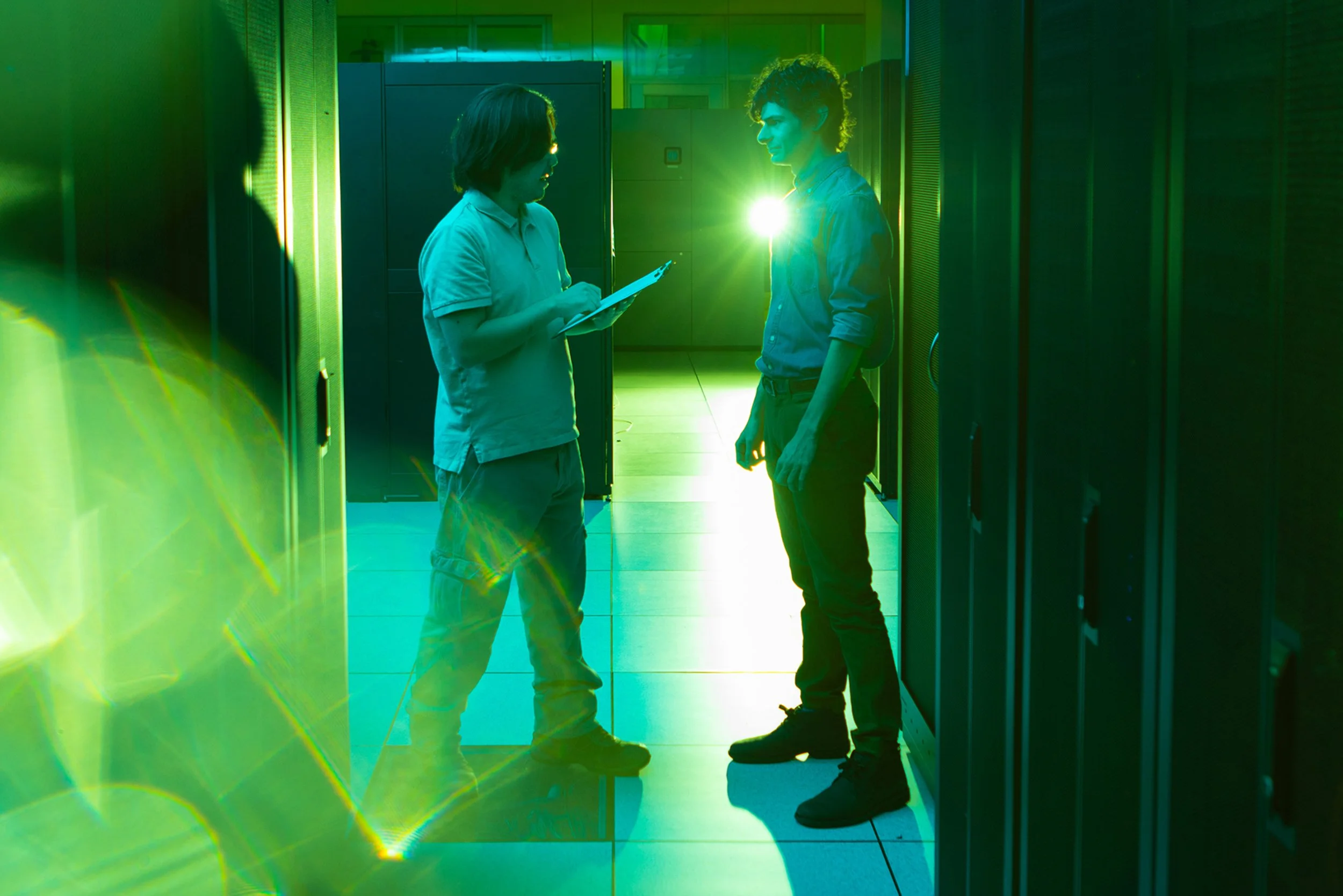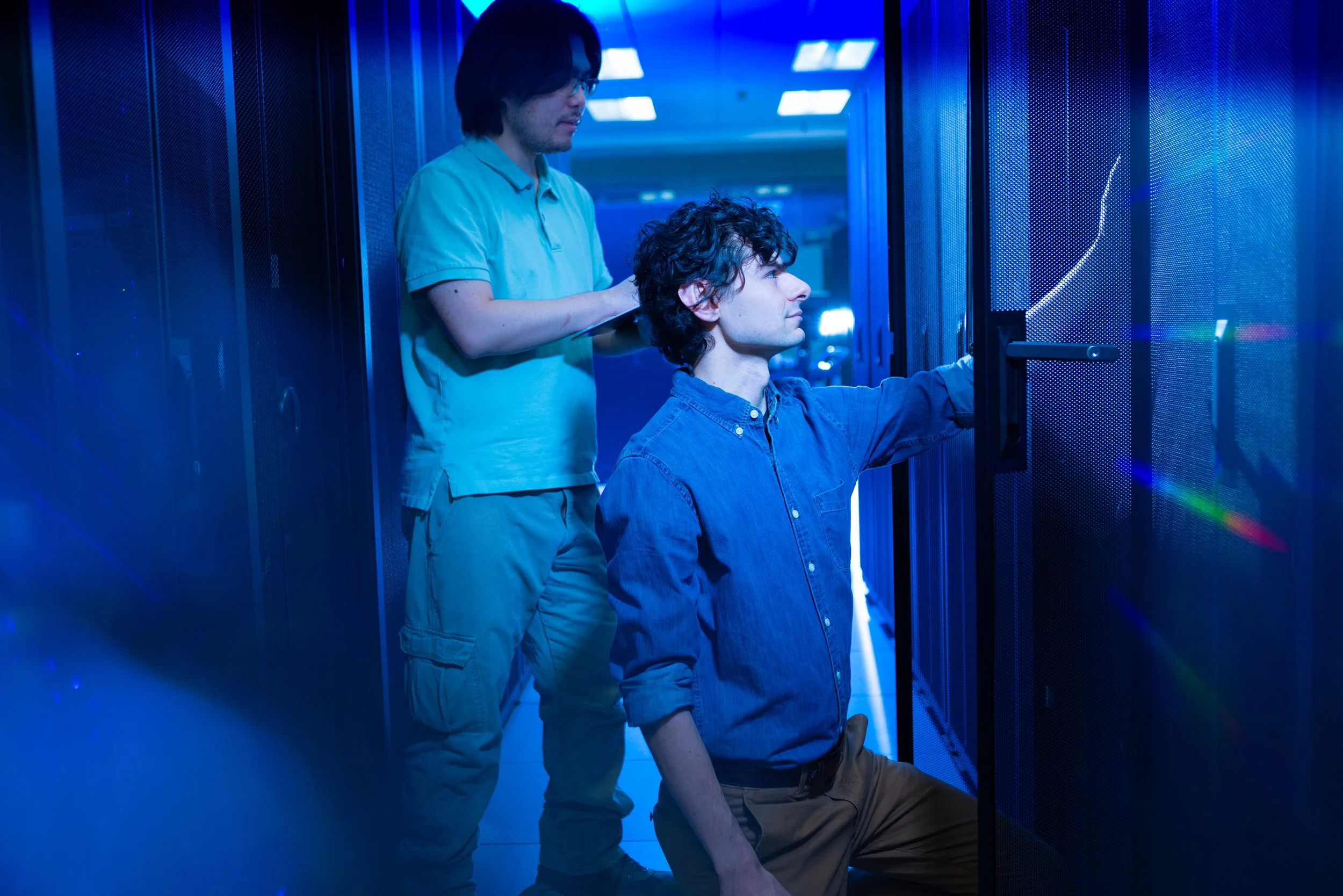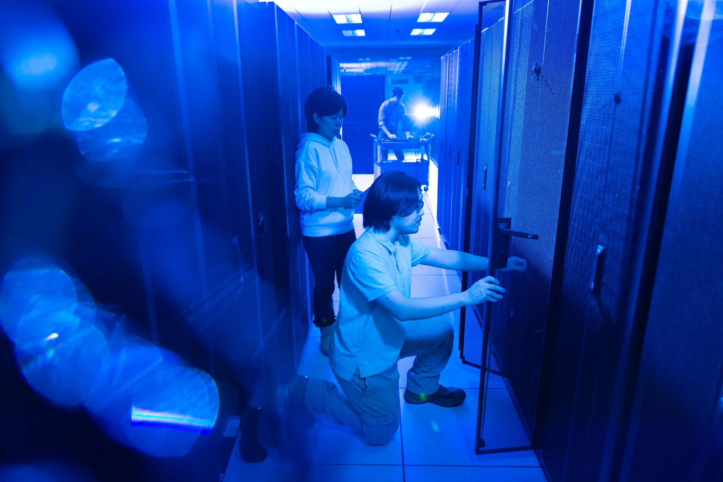 CDAC supported students Nisha Geng, Masashi W. Kimura, and Morgan Redington inspect the computing nodes at the Center for Computational Research at the University at Buffalo. Nisha, Masahi, and Morgan work with CDAC’s partner Dr. Eva Zurek.