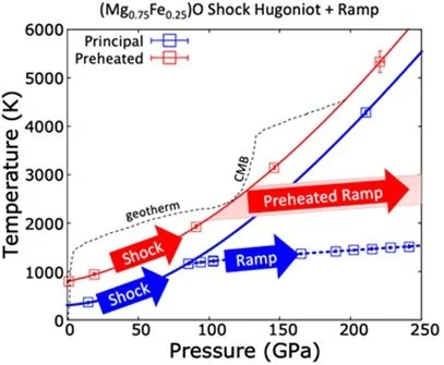 DFT-MD predicted shock-ramp of (Mg0.75Fe0.25)O with low-spin Fe (blue) used in planning the CDAC team’s upcoming Z-shot. To reach a second, higher-T isentrope, a pre-heated “gapless” target is being designed. [Calculations by CDAC student Hannah Bausch (NU) with former CDAC student Joshua Townsend (SNL)].
